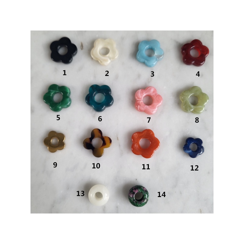 Au choix, un anneau rond ou ovale, anneau rond disponible en clip, et une paire de fleur ou de "donut" en résine..