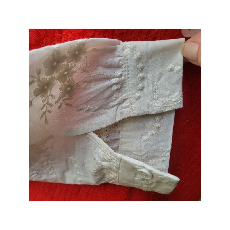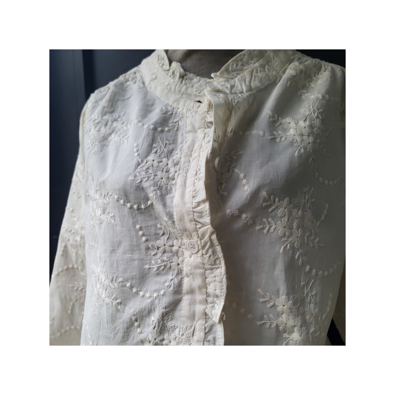 Tunique en coton fait de broderie anglaise, on aime ce style ancien avec ce col montant et le détail des manches, se porte avec tout type de pull ou gilet, ravissant avec du sans manche!!