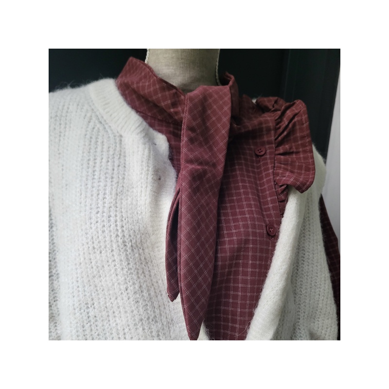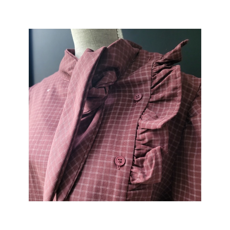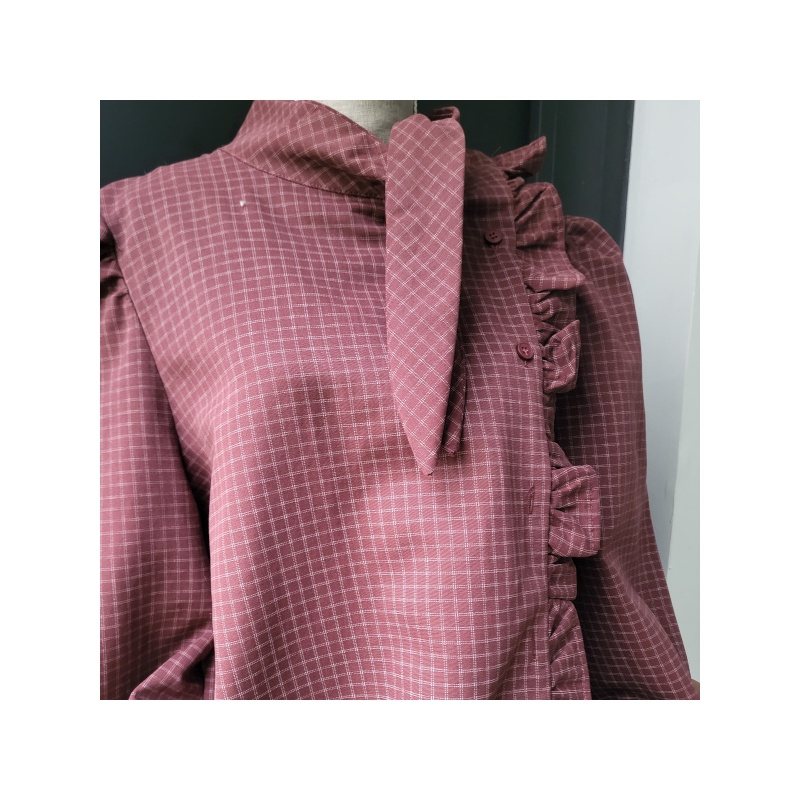 Son tissu à fines rayures et petits carreaux sur fond bordeaux lui confère un look raffiné et unique. Le col montant orné d’une lavallière et la patte de boutonnage à froufrous soulignent son esprit romantique et féminin, parfait pour un look distingué au quotidien.