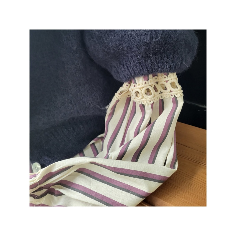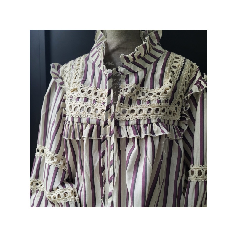 Tunique en coton fait de ravissant détail ajouré, on aime ce style ancien avec ce col montant et le détail des manches, le tout sur une jolie rayures bordeaux et marine.. coloris dans l'air du temps, au top avec un gilet sans manche.